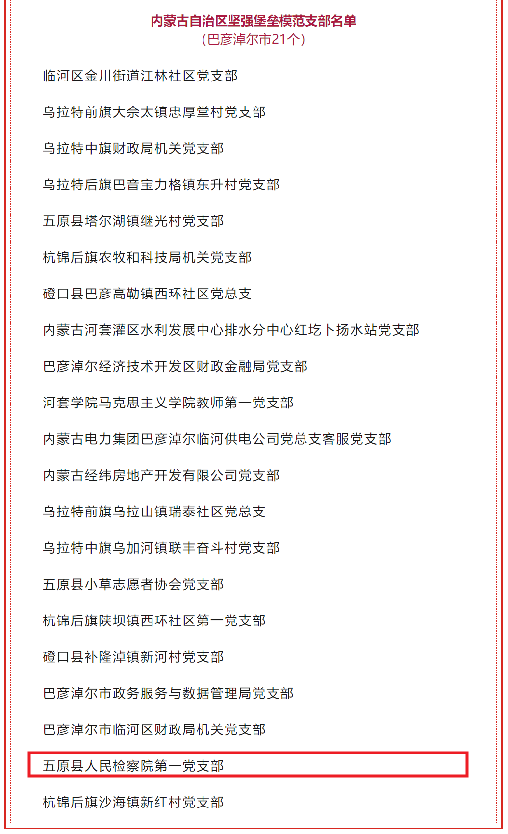 近日,内蒙古自治区党委组织部公布“内蒙古自治区坚强堡垒模范支部”选树名单,五原县人民检察院第一党支部从众多党支部中脱颖而出,光荣上榜!这一殊荣不仅是对我院党支部标准化、规范化建设成果的充分肯定,更是对全体党员干部忠诚履职、司法为民的生动诠释。