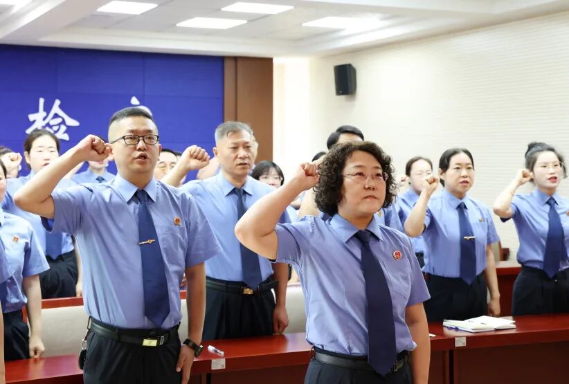 “我志愿加入中国共产党,拥护党的纲领,遵守党的章程……随时准备为党和人民牺牲一切,永不叛党。”在院党组书记、检察长王霞的领誓下,全体党员整齐列队,面向鲜红党旗,高举右拳,庄严宣誓,向党和人民许下一心向党、对党忠诚的铮铮誓言。